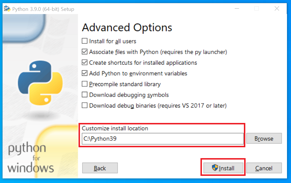 'Advanced Option'에서는 설치 폴더를 찾기 쉽게 'C:\Python39'로 바꿔주고 'Install'을 클릭하면 설치가 진행된다.