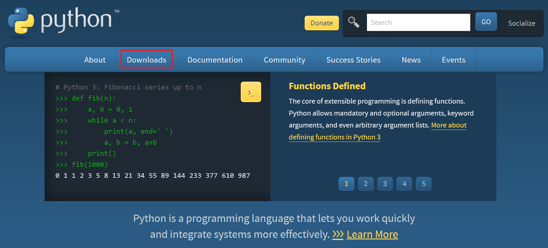 구글에서 'python'을 검색해서 'Welcome to Python.org'를 클릭하여 파이썬 공식 홈페이지로 이동 후, 'Downloads' 항목을 선택한다.