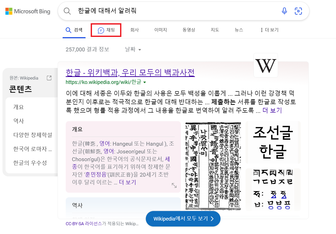 '마이크로소프트 빙' 사이트에서 기존의 '웹 검색창'이 '무엇이든 물어보세요'로 바뀐 것을 확인할 수 있다. 여기에 질문을 하면 바로 챗GPT가 대답을 해주는 것이 아니라, 기존처럼 검색결과가 먼저 출력되고, '채팅' 메뉴를 클릭해야 챗GPT의 답변을 들을 수 있다. 만약, 이 과정이 귀찮다면, Edge 브라우저의 우측 메뉴의 상단에 있는 말풍선 모양의 '빙(Bing)' 아이콘을 클릭하면 바로 대화창이 열리고 챗GPT와 대화를 할 수 있다.