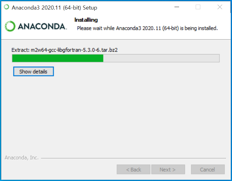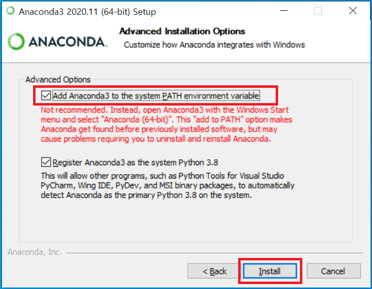 Advanced Install Options에서는 'Add Anaconda3 to the system PATH environmnet variable'에 체크하고 'Install'을 클릭해서 설치를 시작한다.
