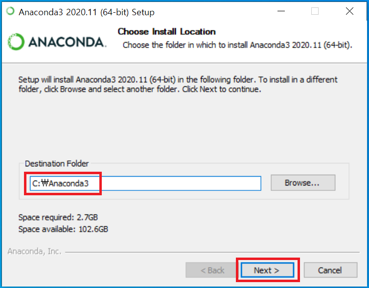 설치 폴더 위치는 나중에 찾기쉬운 위치로 수정 한 후, 'Next'를 클릭한다.