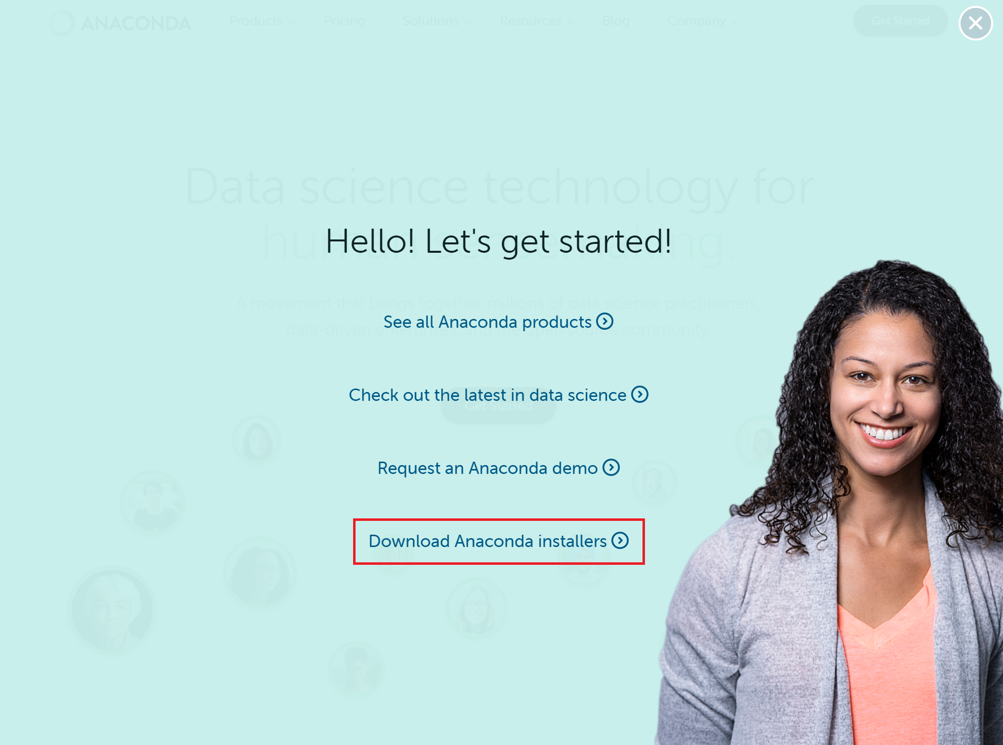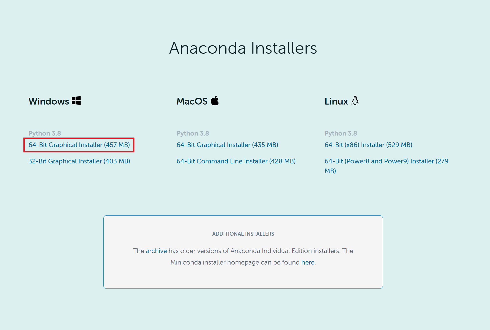 'Get Started' 창이 뜨면, 'Download Anaconda installers'를 클린한 후, 자신의 컴퓨터 사양에 맞는 버전으로 다운로드 한다.