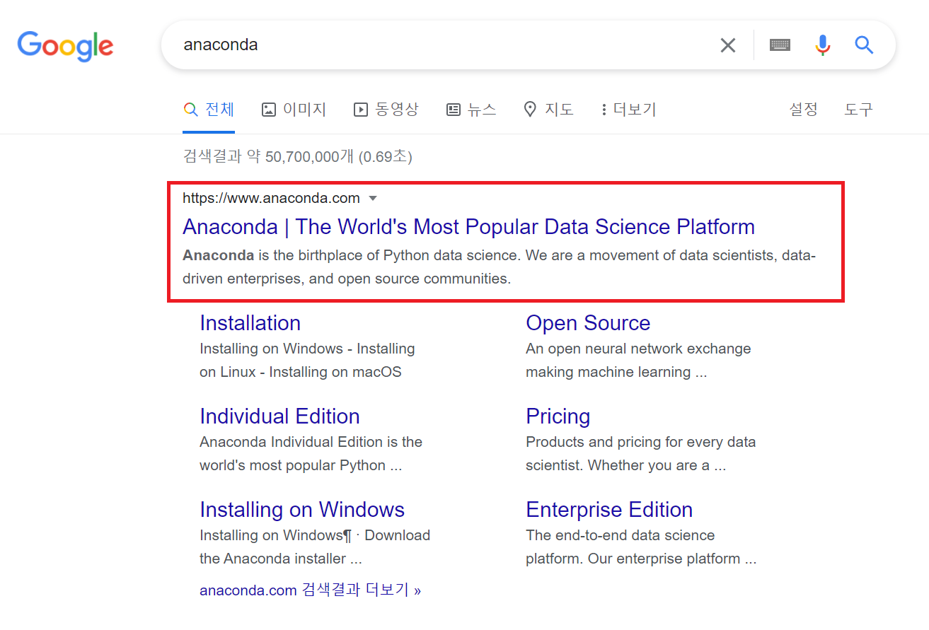 구글에서 'anaconda'을 검색해서 'Anaconda | The World's Most Popular Data Science Platform'을 클릭하여 아나콘다 공식 홈페이지로 이동 후, 'Get Started' 항목을 클릭한다.