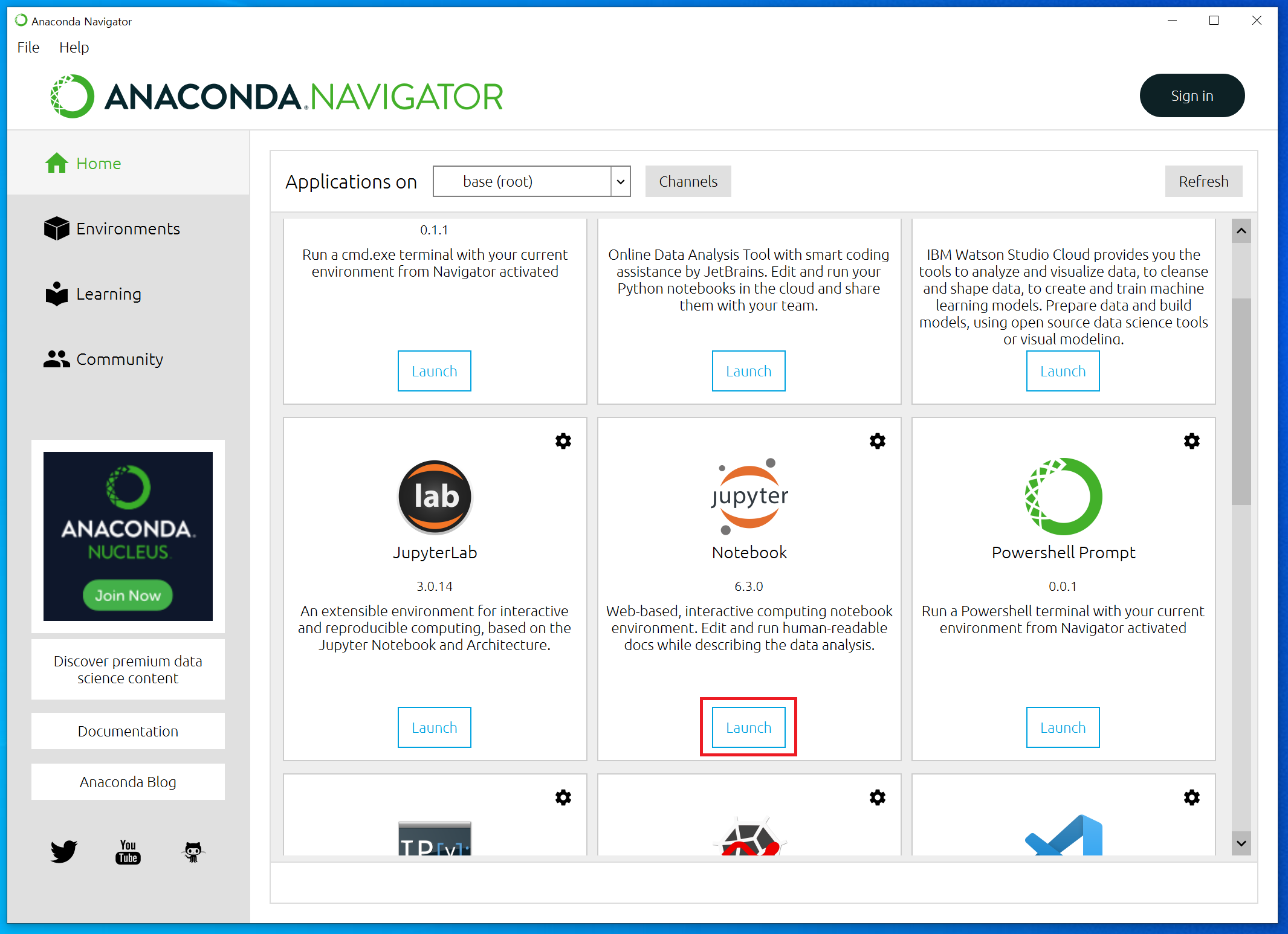 jupyter_notebook_config.py 파일을 저장하고 Anaconda Navigation에서 Jupyter Notebook을 실행하면 설정한 경로에서 시작하는것을 확인할 수 있다.