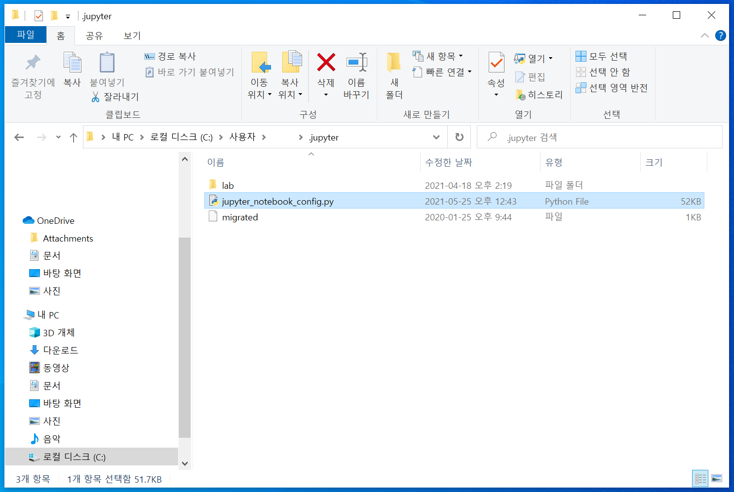 이렇게 확인한 jupyter_notebook_config.py 파일경로를 윈도우 탐색기를 실행시켜서 해당경로로 찾아간 후, 메모장으로 파일은 연다.