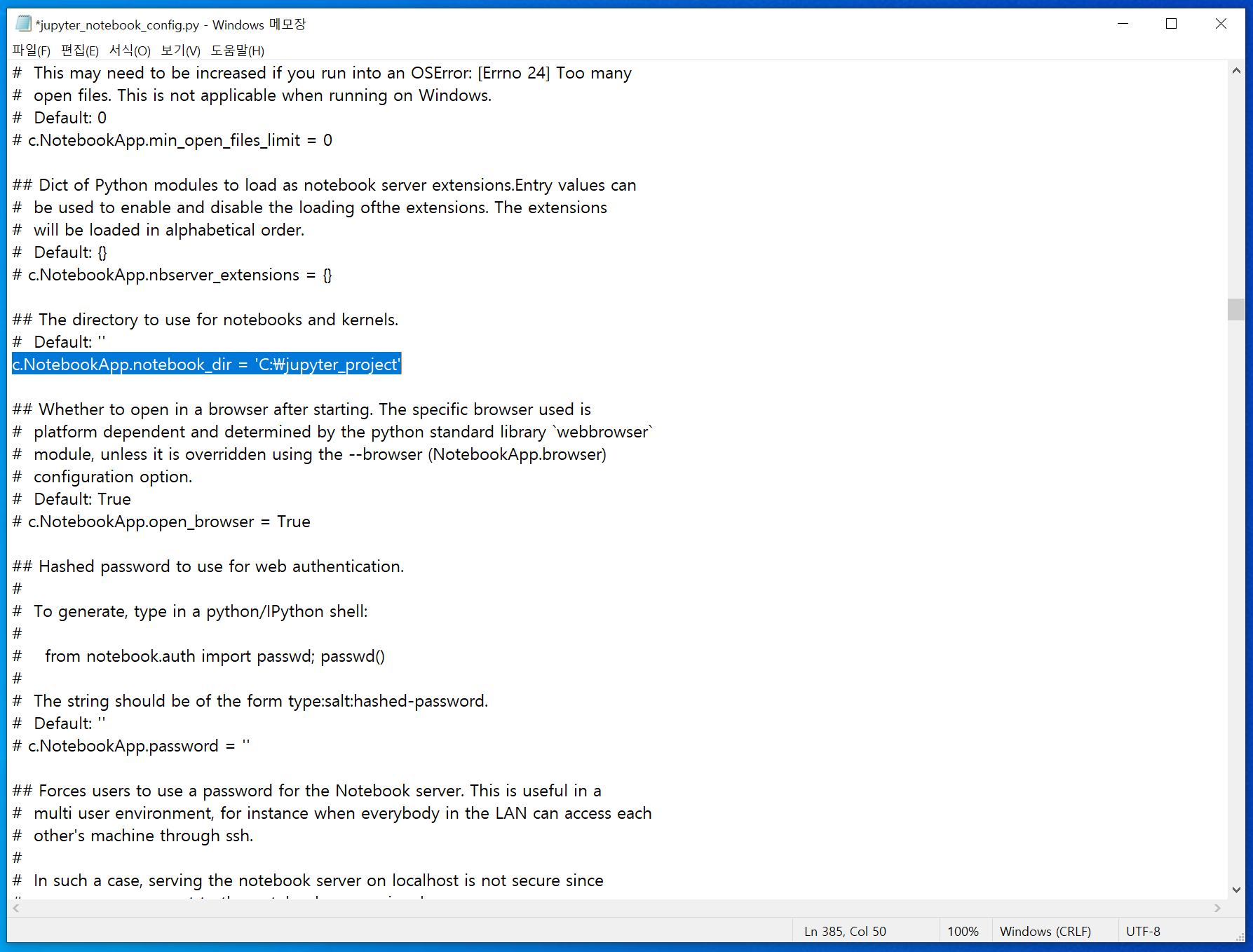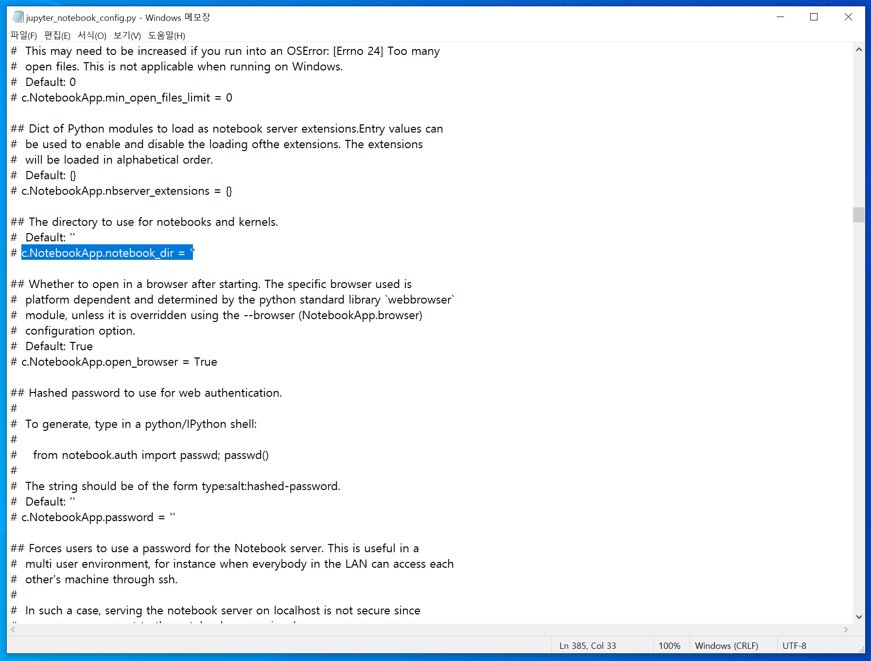 jupyter_notebook_config.py 파일 내에서 # c.NotebookApp.notebook_dir = ''가 있는 위치를 찾아서 앞쪽에 붙어있는 주석표시인 '#'을 지워주고 '' 사이에 원하는 경로를 입력해준다.