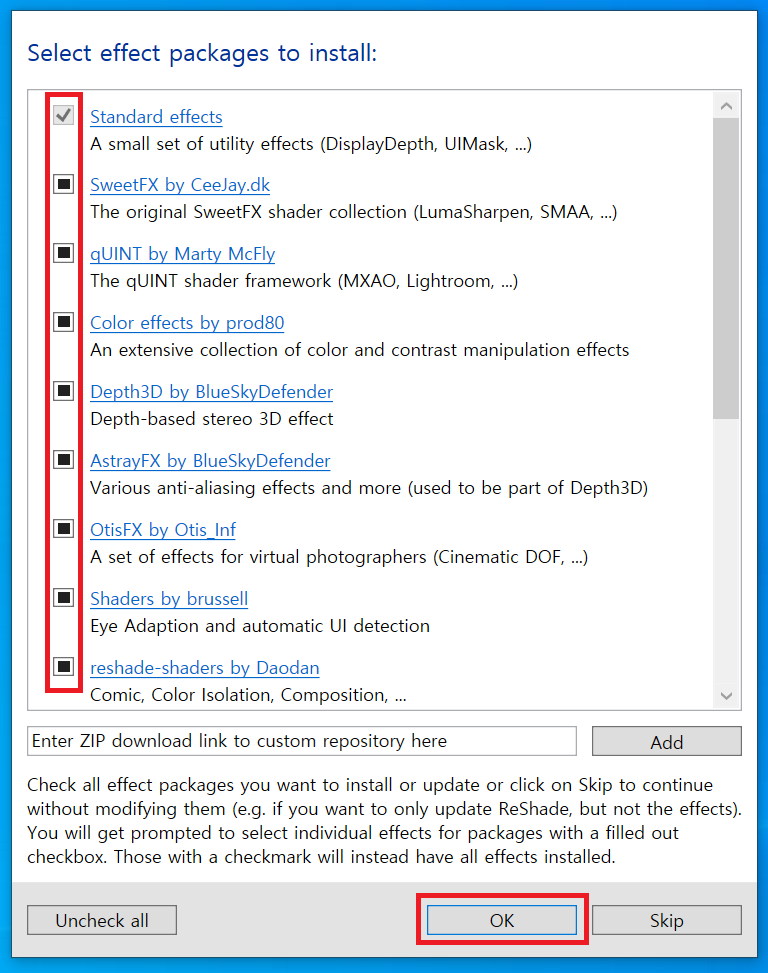 Rendering API 선택을 완료하고 나면 Effect Package를 선택하는 창이 나타나는데 모두 선택하고 'OK' 버튼을 클릭한다.