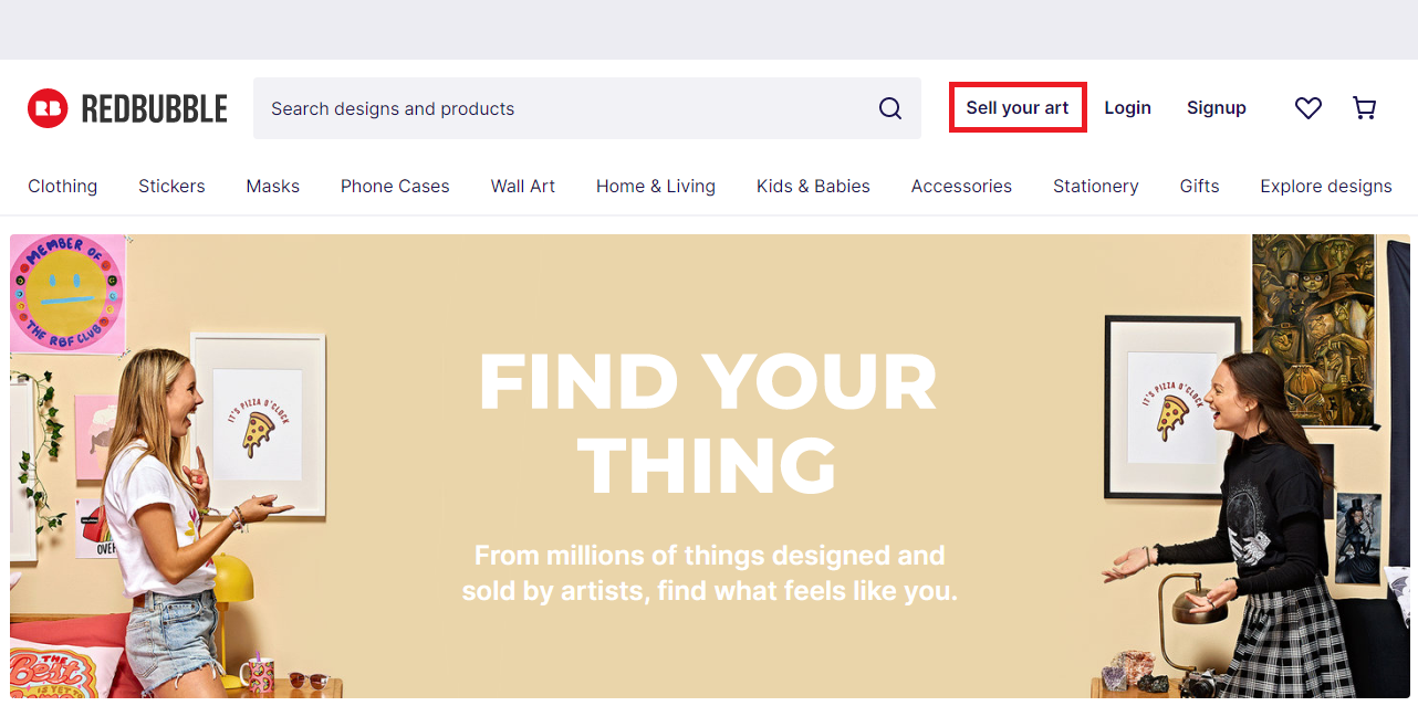 검색사이트에서 'red bubble'을 검색하거나 https://www.redbubble.com/을 입력하여 레드버블 홈페이지로 이동 후, 상단 메뉴에서 'Sell your art'를 클릭한다.