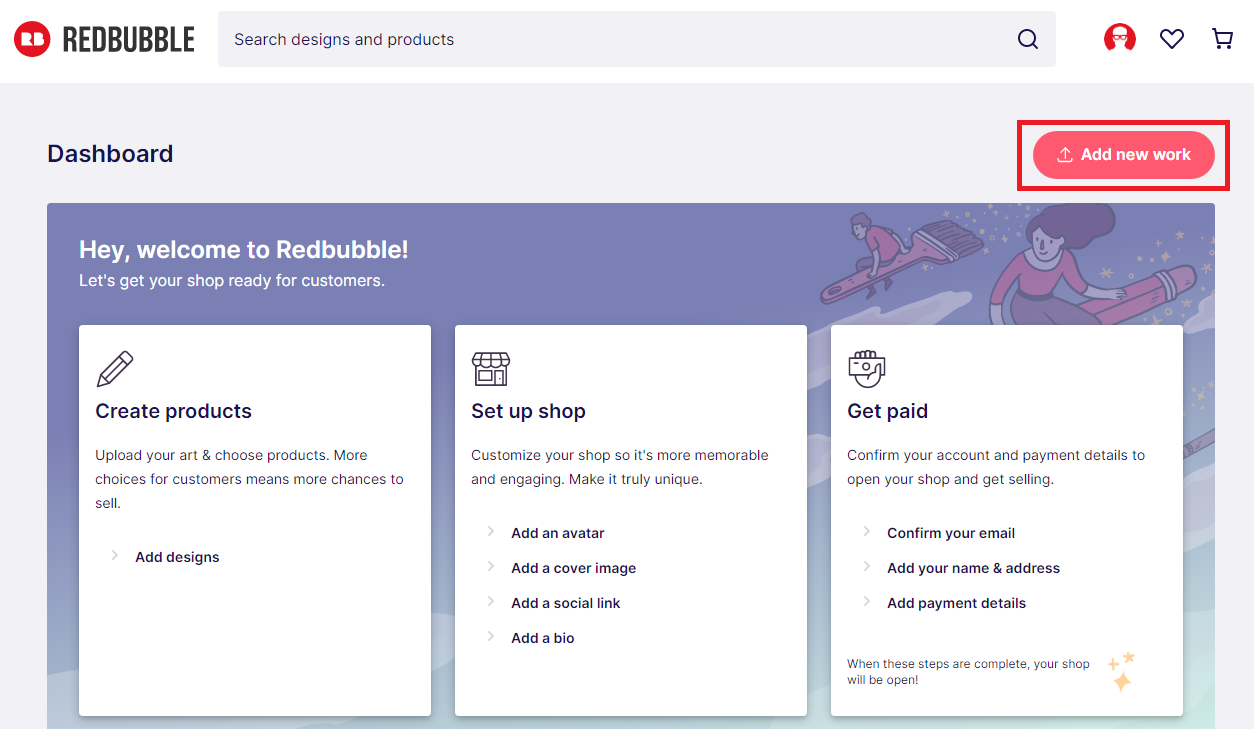 Dashboard에서 우측 상단에 있는 'Add new work'를 클릭해서 Add new work 페이지가 나타나면, 'Up load new work'에 등록하려는 디자인 파일을 드래그해서 내려놓는다.