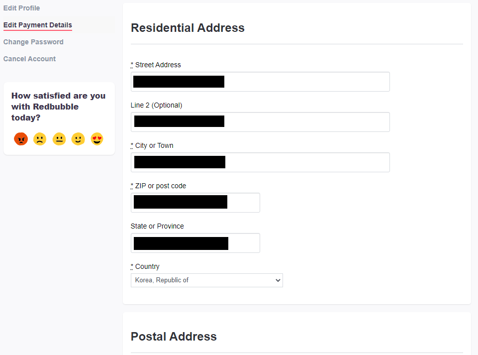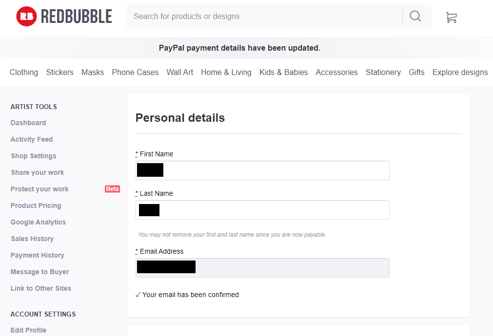 디자인 등록 및 설정이 완료되면 이메일 인증, 주소 입력, Paypal 인증을 완료하면 Redbubble에서 자신의 디자인을 판매할 준비가 완료된다.