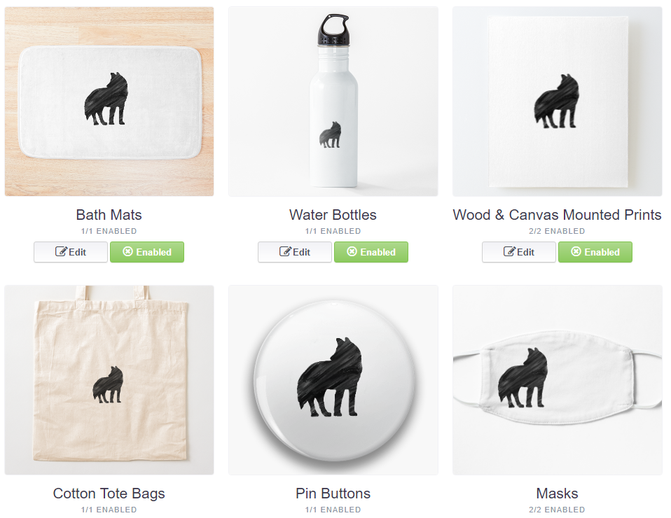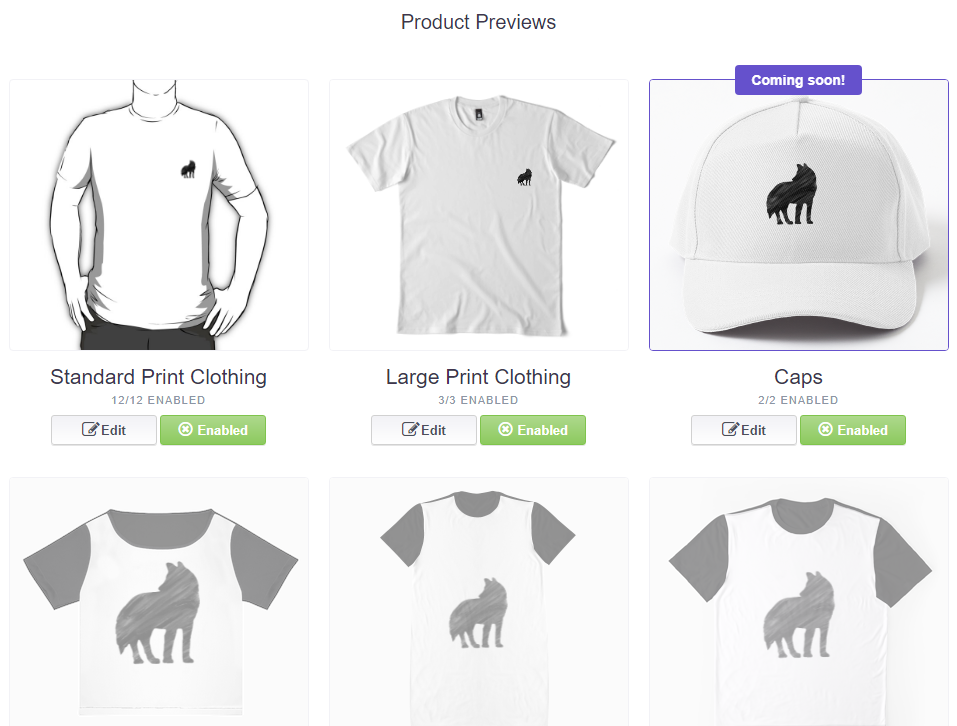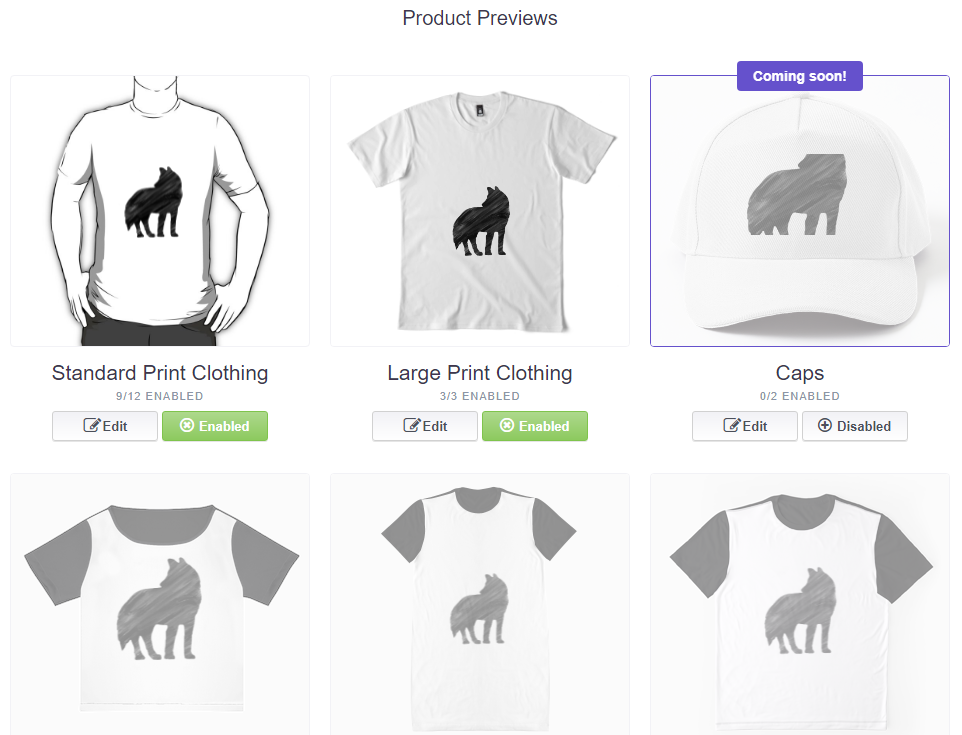 미리보기에 적용된 디자인은 상품에 따라 디자인이 잘리거나 위치 조정이 필요한 경우가 있으므로 각 상품별로 클릭해서 스케일과 위치를 상품에 맞게 조정해주고 판매 여부(Enabled/Disabled)를 설정해준다.
