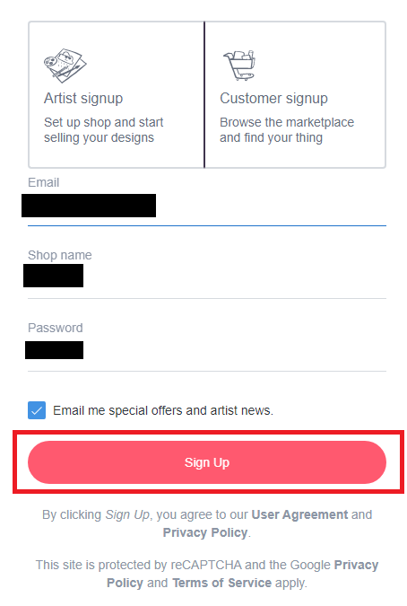 회원가입 페이지에서 'Artist signup'을 선택하고 이메일 주소와 비밀번호를 입력하고 'Sign Up'을 클릭하면 가입이 완료되고 Dashboard가 나타난다.