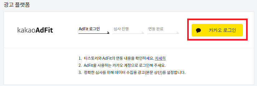 'AdFit 광고 연동하기'를 클릭한 다음, 아래의 광고 플랫폼 항목에서 '카카오 로그인'을 클릭하면 약관 동의 페이지로 이동한다.