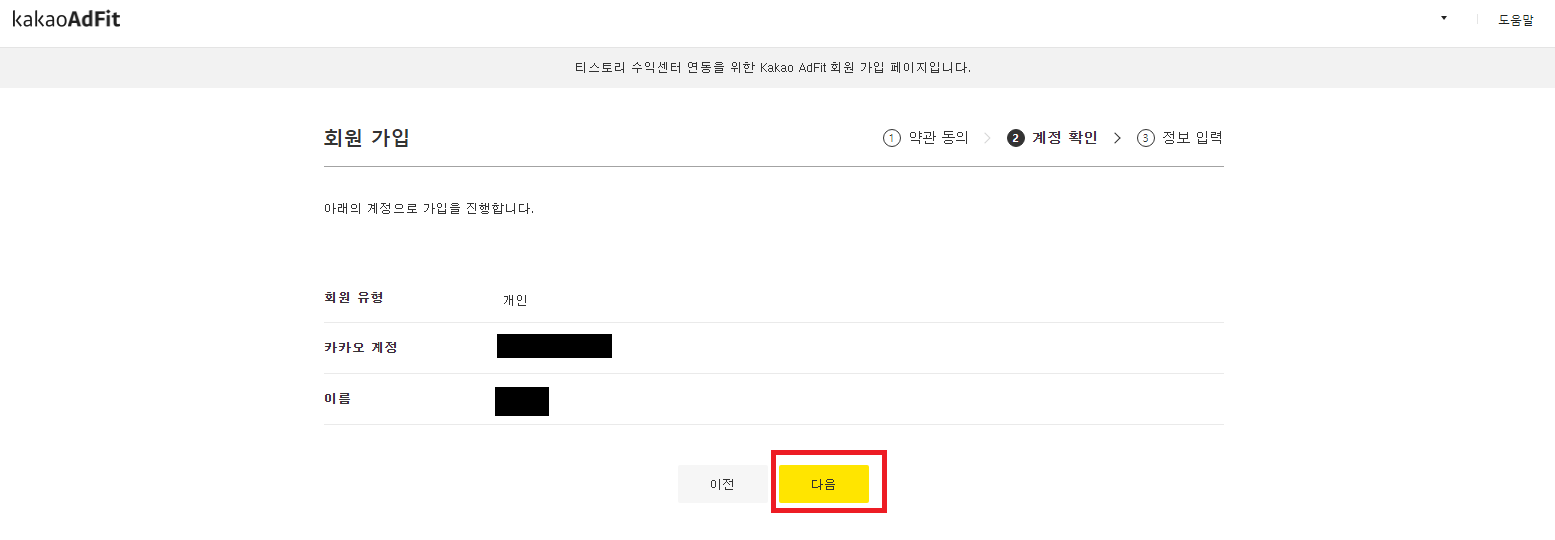 약관을 동의하고 나면 회원가입을 위한 카카오 계정 확인과 사용자 정보를 차례로 입력하고 '가입'을 클릭하면 가입이 완료되고 '티스토리 수익센터로 이동'을 클릭해서 다시 티스토리로 돌아온다.