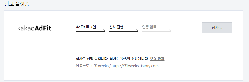 티스토리의 수익 페이지로 돌아오면 광고 플랫폼 항목에 '심사 중'이라고 표시되는 것을 확인할 수 있다.