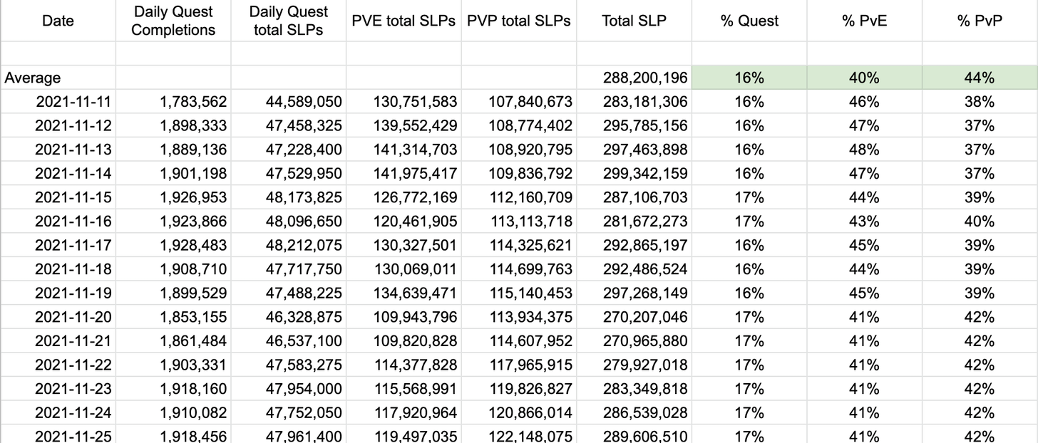 간단히 말해서 SLP의 약 40%는 모험 모드에서 생성되고 SLP의 약 44%는 PVP에서 생성되며 나머지(~14%)는 일일 퀘스트를 요청하는 플레이어에서 생성됩니다.