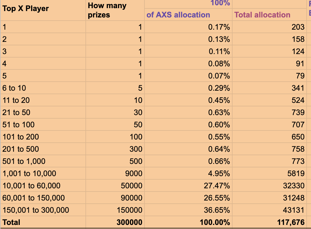 시즌 20의 경우 순위표 슬롯 수를 300,000개로 확장하고 제공하는 AXS의 양을 117,676개로 늘렸습니다. 이것은 경쟁적인 Axie 현장을 강화하고 생태계에서 양질의 Axie 팀에 대한 더 많은 수요를 창출할 것입니다. 이는 시즌 20에 대한 6백만 달러 상당의 상금 풀에 해당합니다!