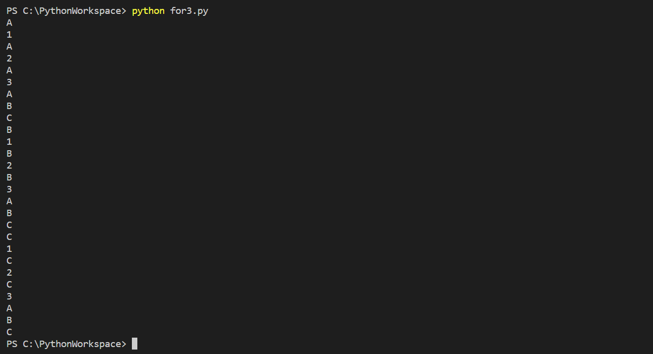 코드 작성이 완료되면, 'Run' 탭에서 'Run and Debug'를 클릭하거나, Powershell에서 'python for3.py'를 입력해서 작성된 'for3.py'의 코드를 실행시키면, 리스트 'aa'의 요소인 'A', 'B', 'C'와 'bb'의 요소인 '1', '2', '3'가 for문의 종속관계에 따라 순서대로 출력되는 것을 확인할 수 있다.