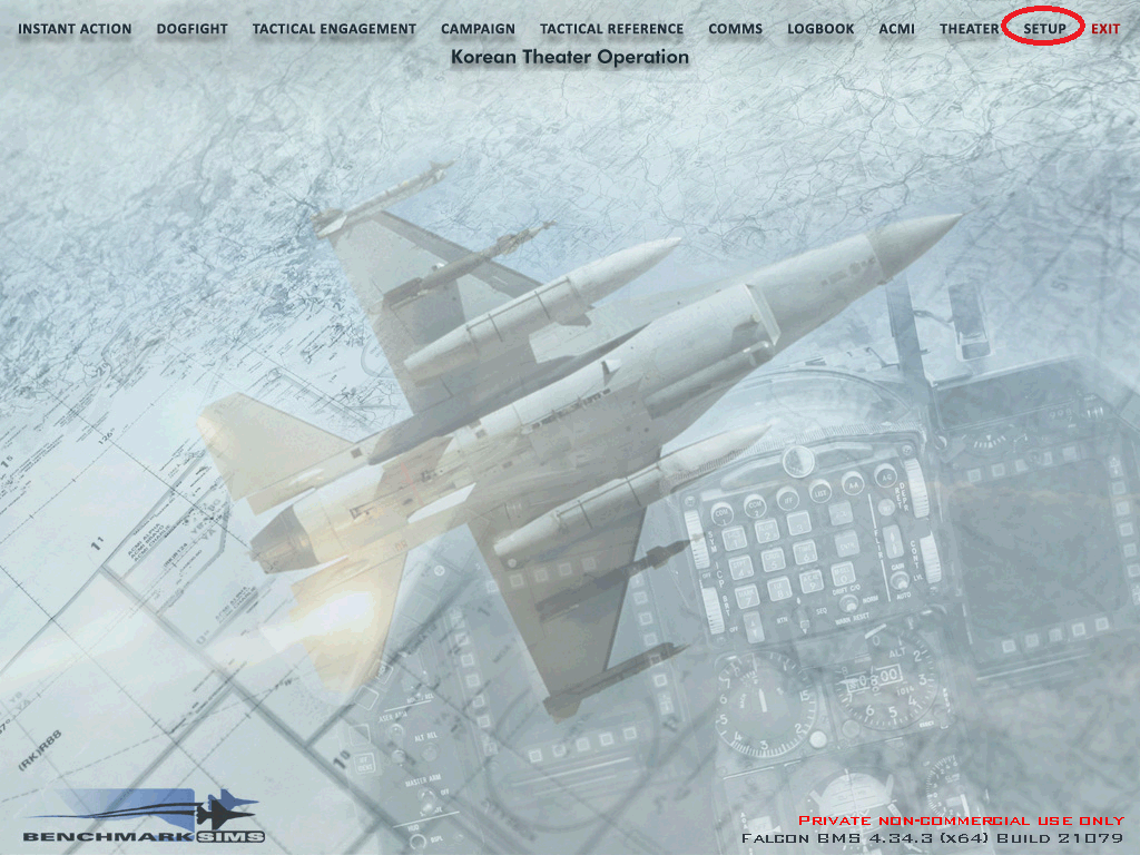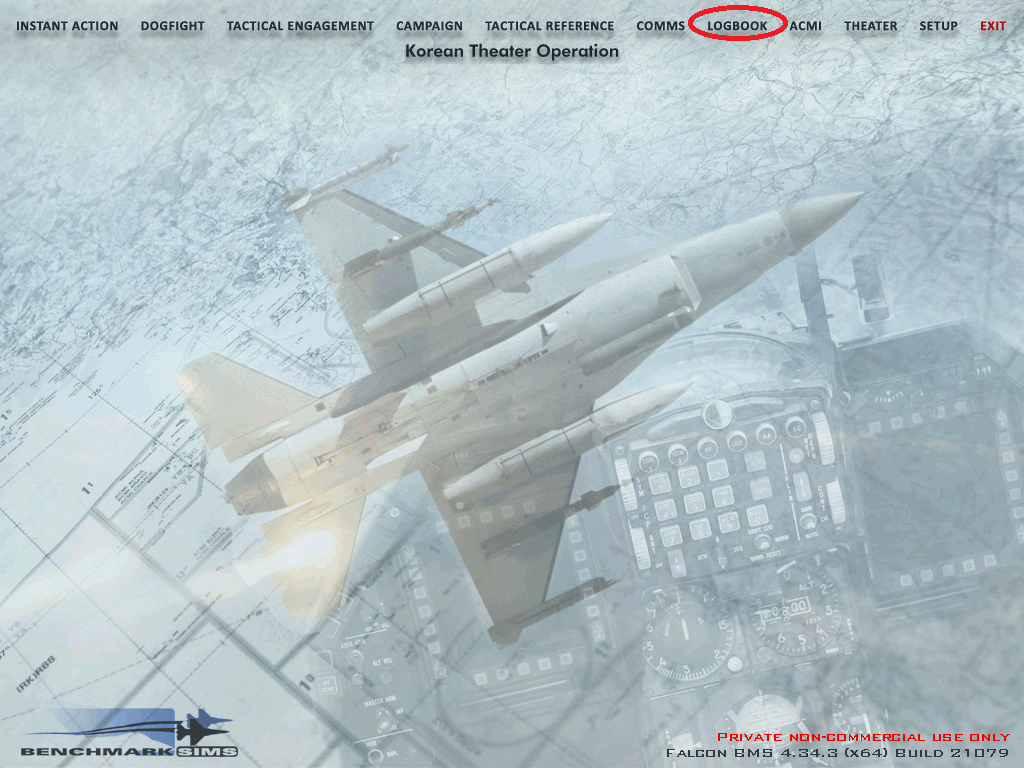 Falcon BMS는 로그북이 수정되면 설정값이 모두 초기화 되므로 메인메뉴에서 'LOGBOOK'을 클릭해서 로그북부터 작성해준다