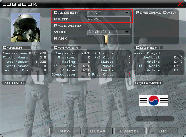 로그북 작성은 Callsign과 Pilot(파일럿 이름)을 입력하고 추가로 Voice와 Squadron 등을 설정해준다
