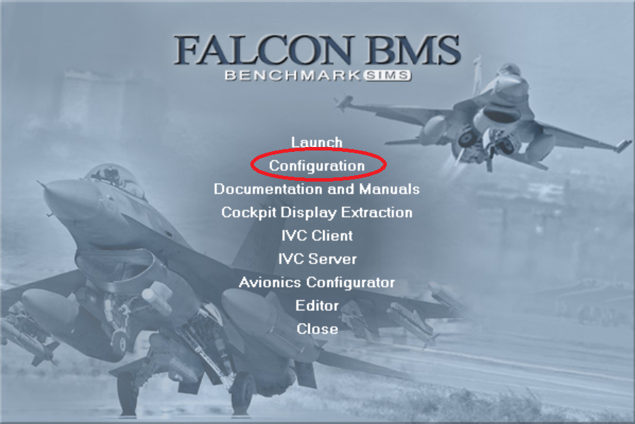 모든 설정이 완료되었으면 설정을 저장하고 게임을 종료시킨 후, 다시 'Falcon BMS 4.34'를 실행해서 'Configuration'을 선택한다