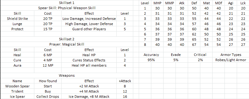 게임 플레이에서 나는 일종의 치료사가 필요하다는 것을 알았습니다. 그리고 헌신적인 캐릭터가 있다면 고전적인 RPG 사제로 일하지 않겠습니까? 나는 그녀가 "연약한 아가씨"의 클리셰가 되지 않도록 높은 방어력을 갖게 했습니다. 그녀의 기술로 그녀는 주로 치유 또는 피해 흡수에 중점을 둡니다. 다시 한번,나는 전투에서 그녀에게 약간의 다양성을 추가하기 위해 런지 스킬과 대조되는 스킬을 넣었습니다.