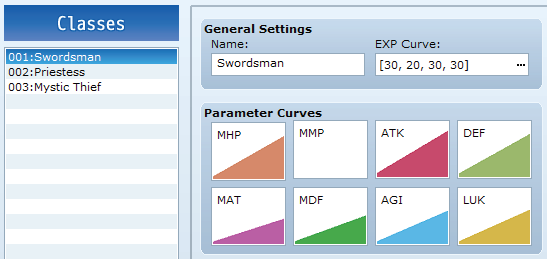 여기에서 클래스 이름과 클래스 능력치에 대한 매개변수 곡선을 볼 수 있습니다. 매개변수 곡선은 각 레벨에 대한 능력치 평가를 결정합니다. 클래스 이름을 입력한 후 능력치 중 하나를 더블 클릭하면 매개변수 곡선 상자가 팝업 됩니다.