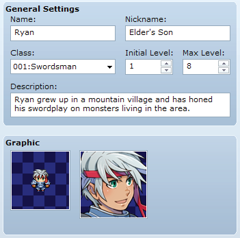 이제 Actor 탭으로 넘어갈 것입니다. 여기에서는 아래에 표시된 일반 설정 및 그래픽 섹션에 중점을 둘 것입니다. 캐릭터 이름을 입력하고 Actor를 클래스에 연결합니다.