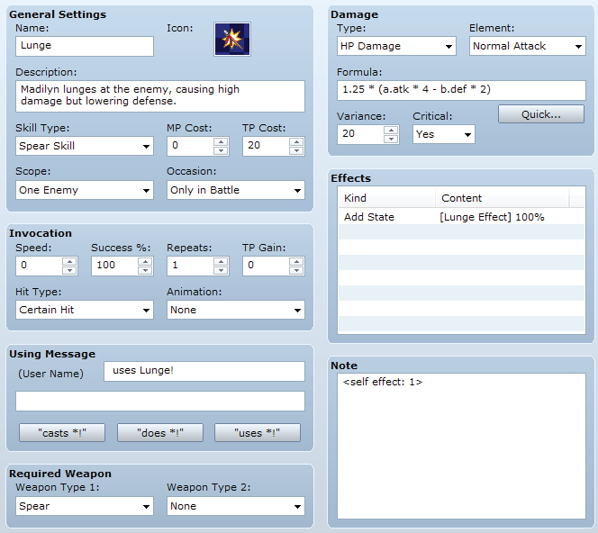 이제 런지 스킬 자체를 만들 수 있습니다. 공격 스킬을 카피하는 것부터 시작했습니다. 이후 일반 공격보다 25% 더 많은 피해를 주도록 피해 공식을 변경했습니다. 창 스킬 카테고리에 할당하고 TP 비용 20을 부여하고 설명과 메시지 사용 후 남은 것은 상태를 구현하는 것입니다.