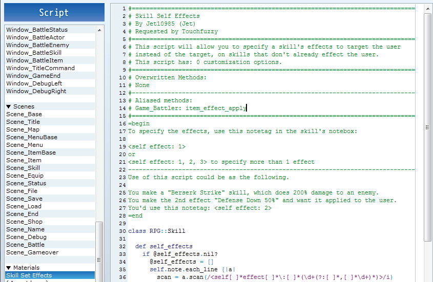 이 경우 계획은 RPG Maker Web Forums, Jet10985(일반적으로 Jet라고 함)의 회원이 만든 스크립트를 사용하는 것입니다. 이 스크립트를 사용하면 기술을 만든 다음 대상 대신 기술 사용자에게 영향을 미치는 특정 효과를 표시할 수 있습니다.