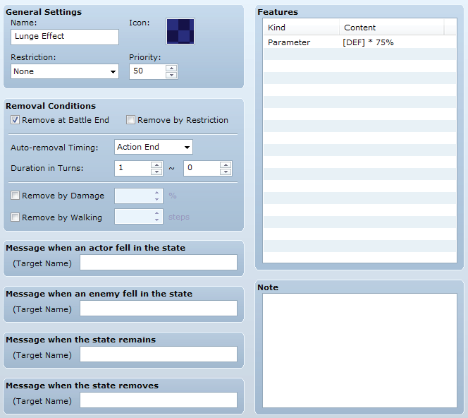 가장 먼저 해야 할 일은 캐릭터의 방어력을 25% 낮추는 상태를 만드는 것입니다. 이렇게 하려면 상태에 캐릭터 DEF를 75% 곱하는 기능을 제공합니다. 이제 왜 그냥 디버프를 사용하지 않습니까? 지속 시간을 더 잘 제어할 수 있기 때문에 이 경우 상태를 선호합니다. 이 경우 다음 턴의 캐릭터가 끝날 때 종료되기를 원합니다. 이를 위해 제거 조건이 구성됩니다.
