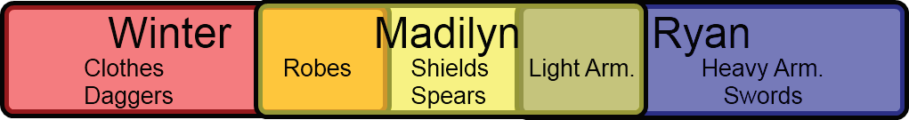 보시다시피 모든 캐릭터는 갑옷을 선택할 수 있습니다. Ryan은 Heavy Armor를 장착하여 정확도, 회피 및 민첩성을 희생시키면서 높은 방어를 할 수 있습니다. Madilyn은 마법 공격과 방어에 대한 보너스 또는 더 높은 방어 중에서 선택해야 합니다. Winter는 마법 공격과 방어, 또는 민첩성, 회피, 정확성 중에서 선택해야 합니다. Madilyn은 또한 Shields와 함께 또 다른 선택을 할 수 있습니다. Shields는 그녀의 방어력을 증가시키지만 정확도를 낮춥니다. 이 모든 것은 선택입니다.