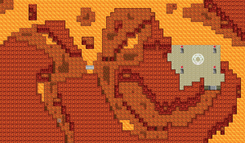 이 단계에서 나는 보스 싸움을 위해 인공 사원 스타일 영역을 올릴 뿐만 아니라 많은 세부 사항을 추가합니다. 나는 더 어두운 용암석 타일을 사용하여 걸을 수 있는 영역을 시각적으로 조금 나누었고 더 작은 용암 웅덩이를 정기적으로 사용하여 거의 항상 볼 수 있도록 했습니다.