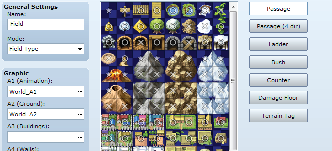타일셋 탭에서 필드 타일셋을 열고 탭 B로 전환합니다. 두 개의 "Dock" 타일이 통과성 X로 설정되어 있는 것을 볼 수 있습니다. O로 바뀔 때까지 통과 가능성을 순환하려면 클릭하기만 하면 됩니다.