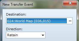 새 전송 이벤트 팝업에는 두 가지 옵션만 있습니다. 방향 옵션은 캐릭터가 전송된 후 향하고 있는 방향을 변경합니다. 당분간은 이것을 그대로 두겠습니다.