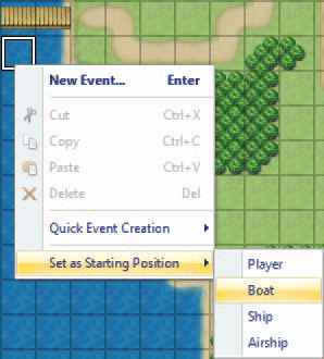 이제 플레이 테스트를 하는 동안 본토에서 섬으로 이동하는 방법이 궁금할 것입니다. 우리는 보트의 시작 위치를 지정할 것입니다. 이렇게 하려면 이벤트 레이어에서 아래 위치를 마우스 오른쪽 버튼으로 클릭하고 시작 위치로 설정 => 보트를 선택합니다. 마을 어딘가에서 이것을 반복하되 대신 시작 위치로 설정 => 플레이어를 선택하십시오.