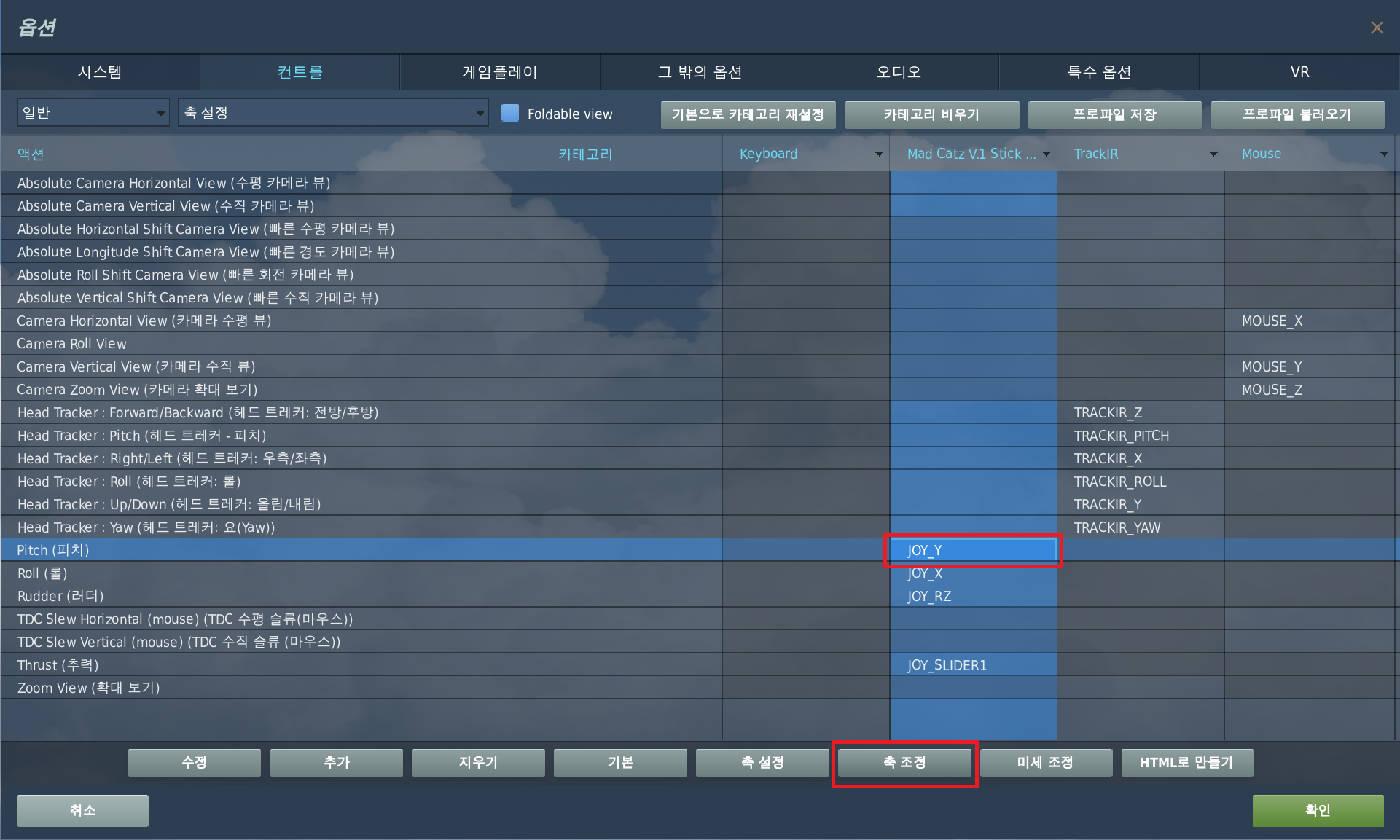 우선 피치 항목에서 'JOY_Y' 부분을 선택하고 '축 조정'을 클릭한다