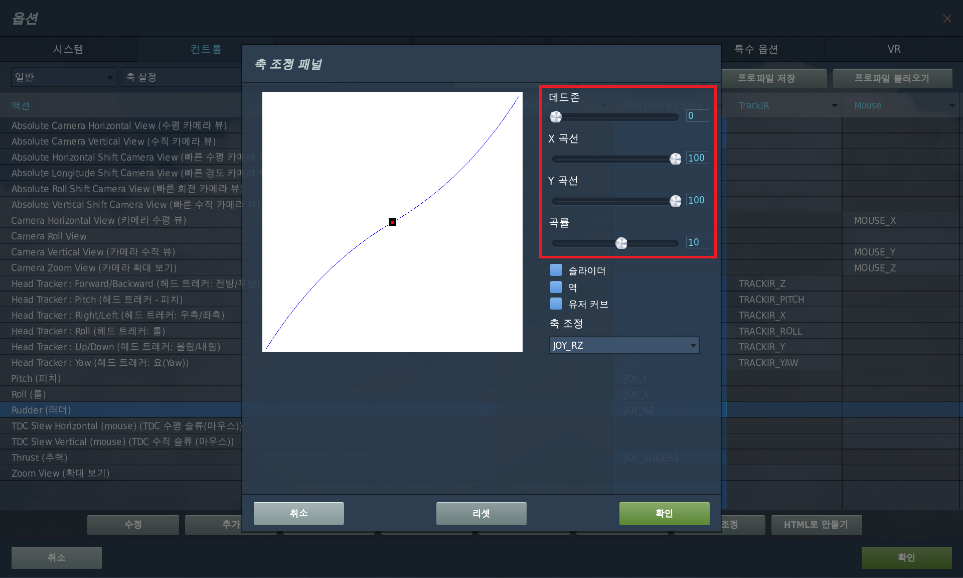 축 조정 패널에서 데드존, X곡선, Y곡선, 곡률을 아래의 값으로 설정해준다