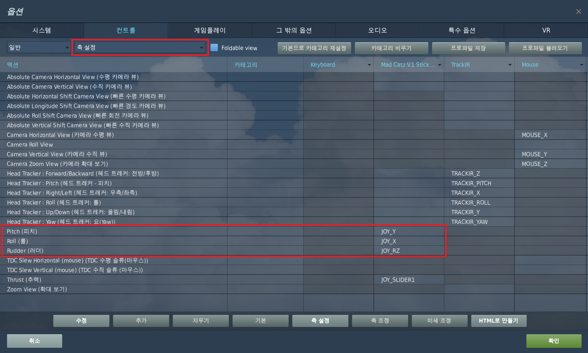조이스틱 축을 조정하는 방법은 [옵션] - [컨트롤] 항목에서 '축 설정'을 선택하고 '피치', '롤', '러더' 항목을 조정해주면 된다
