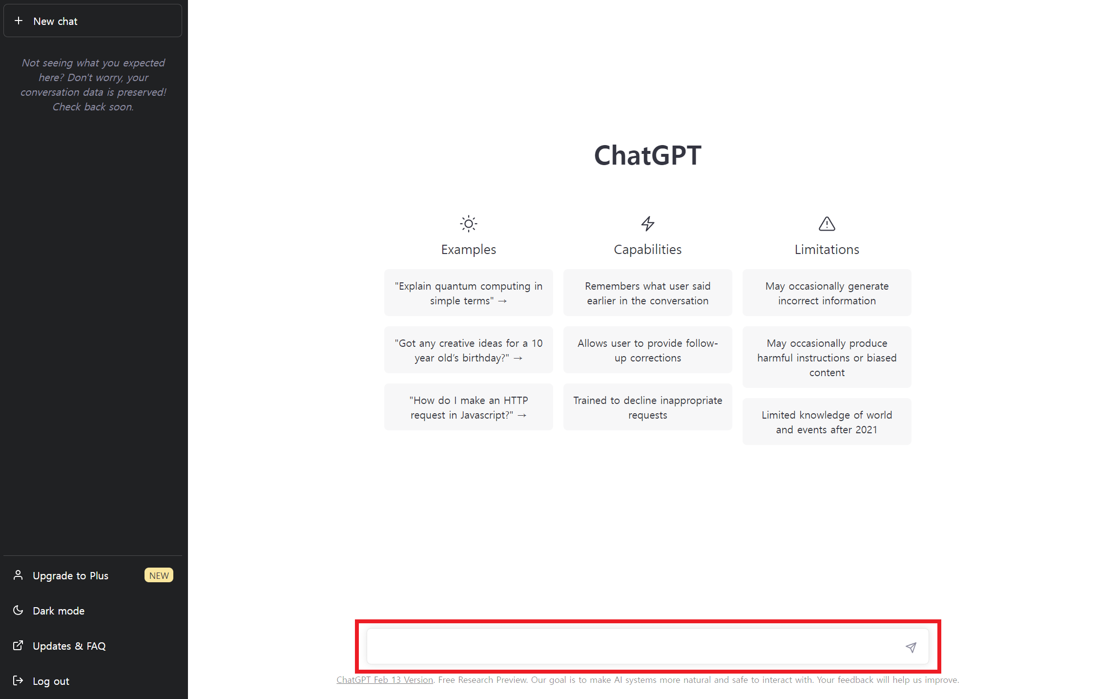 안내사항은 구글 번역기나 크롬 브라우저의 번역 기능을 이용해서 확인하고 'Next'나 'Done'을 눌러서 넘어가면 ChatGPT에게 물어볼 수 있는 몇 가지 예시, 제한사항 등과 함께 입력창이 나타난다.